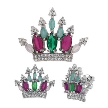 Sterling Silver Multi Color CZ Crown Earrings & Pendant Set