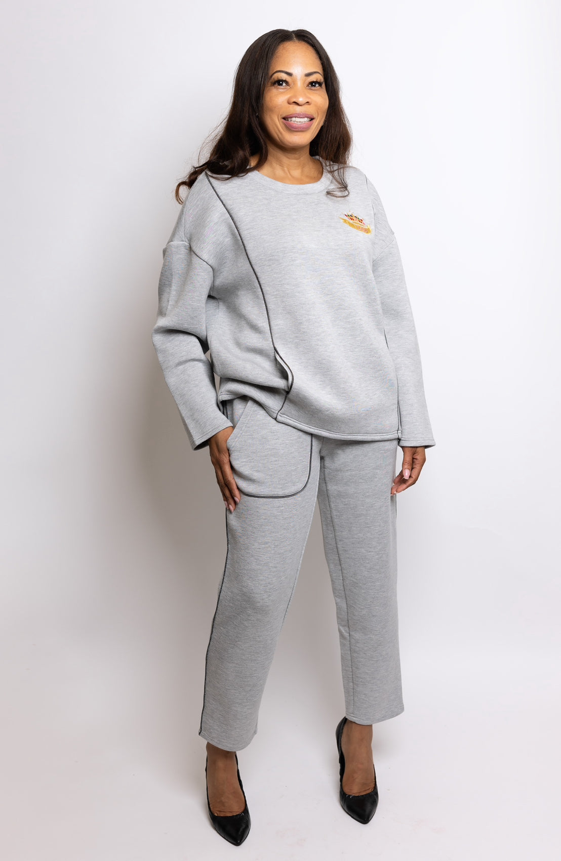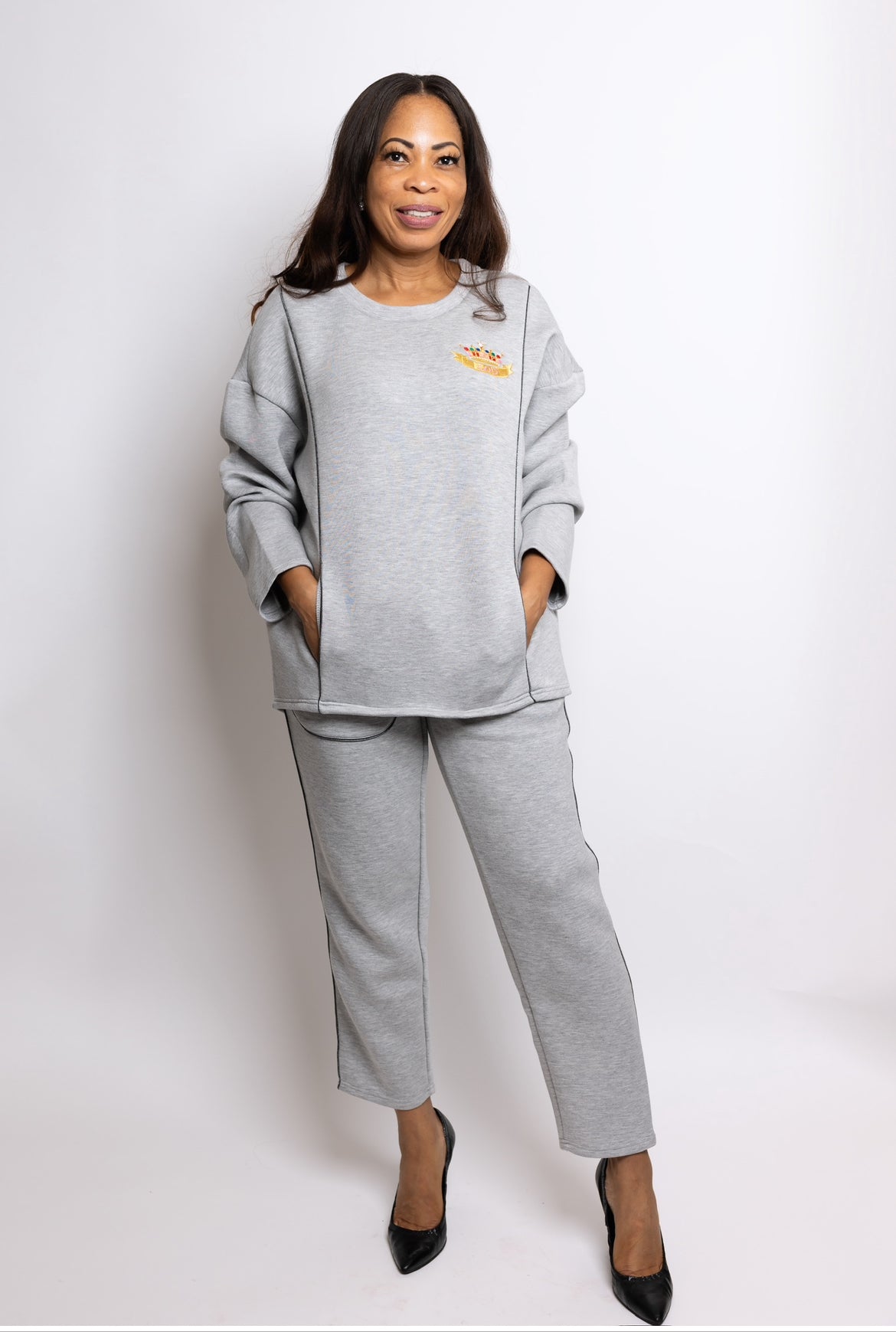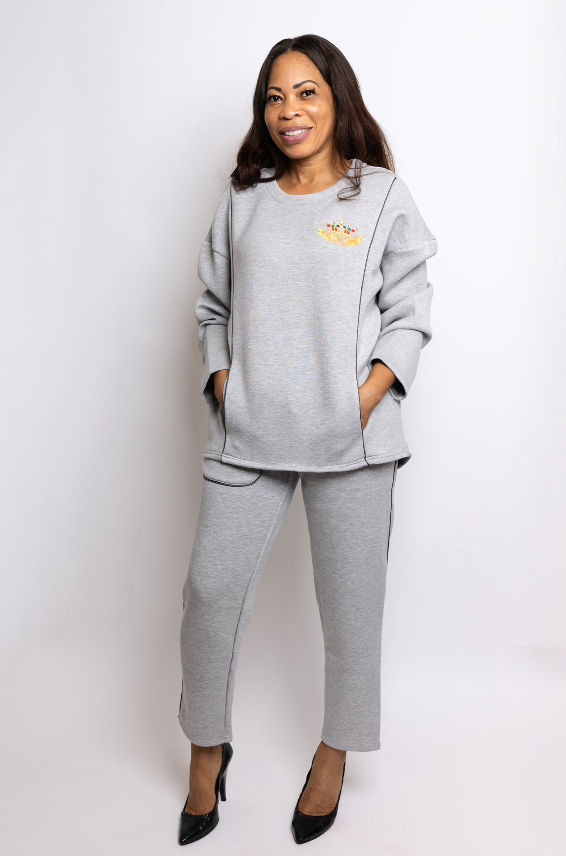 Made with high quality french scuba fabric. Trimmed with metallic beading.Hidden front pockets. Round neck and long sleeves. Stylish and comfy. Model Erica is wearing a medium.