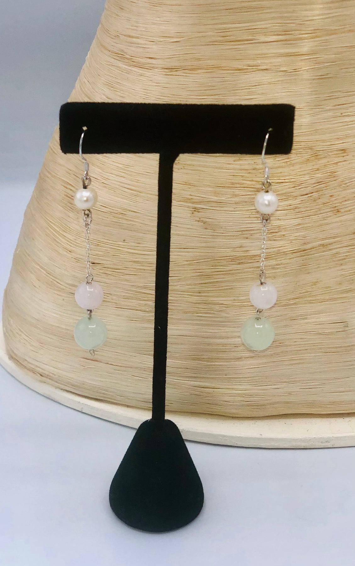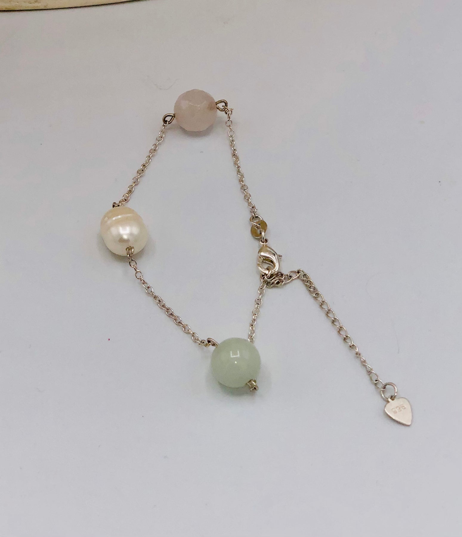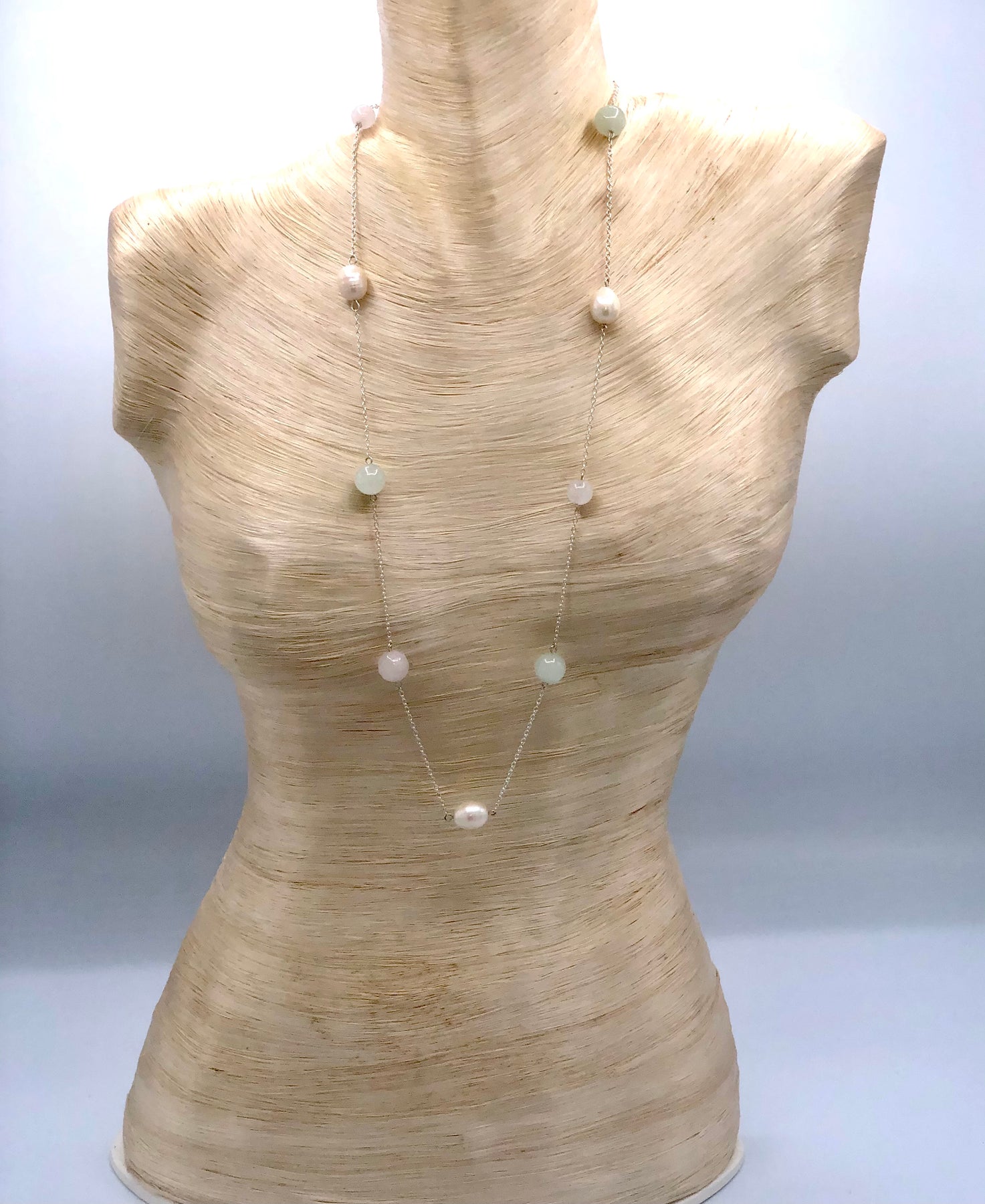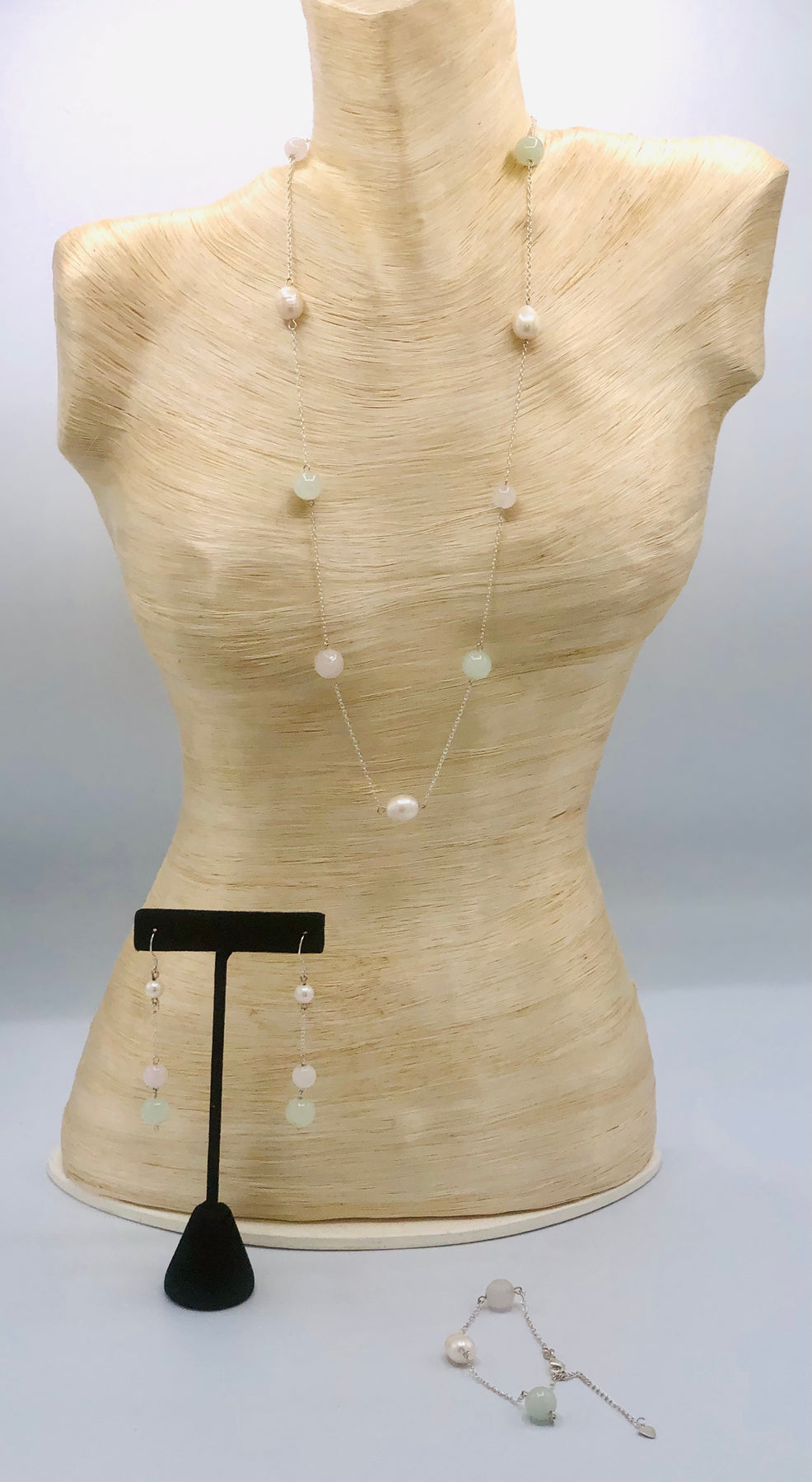 Chalcedony, Rose Quartz and Sterling Silver. 24 inches 3 piece set