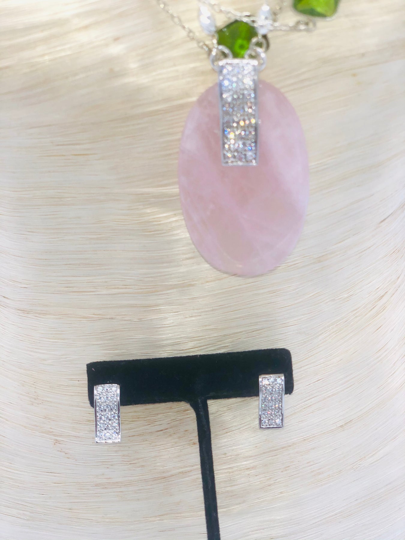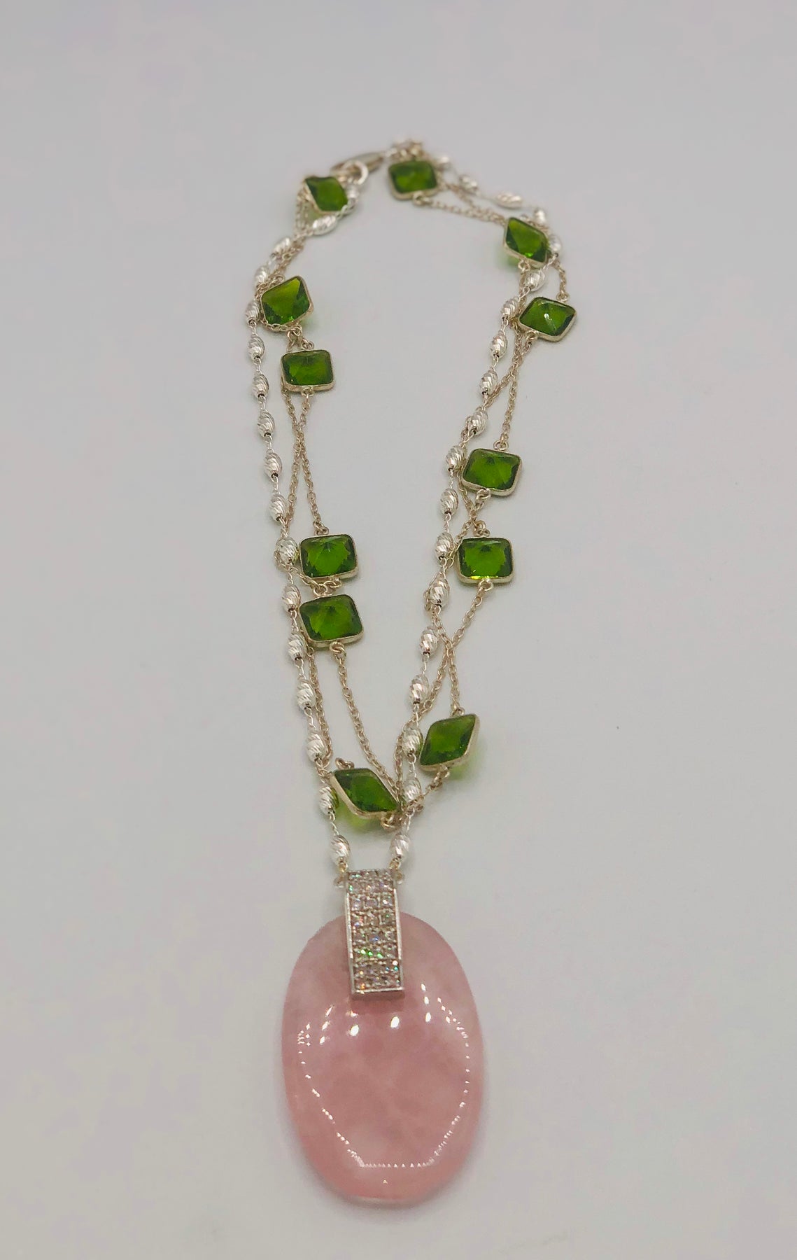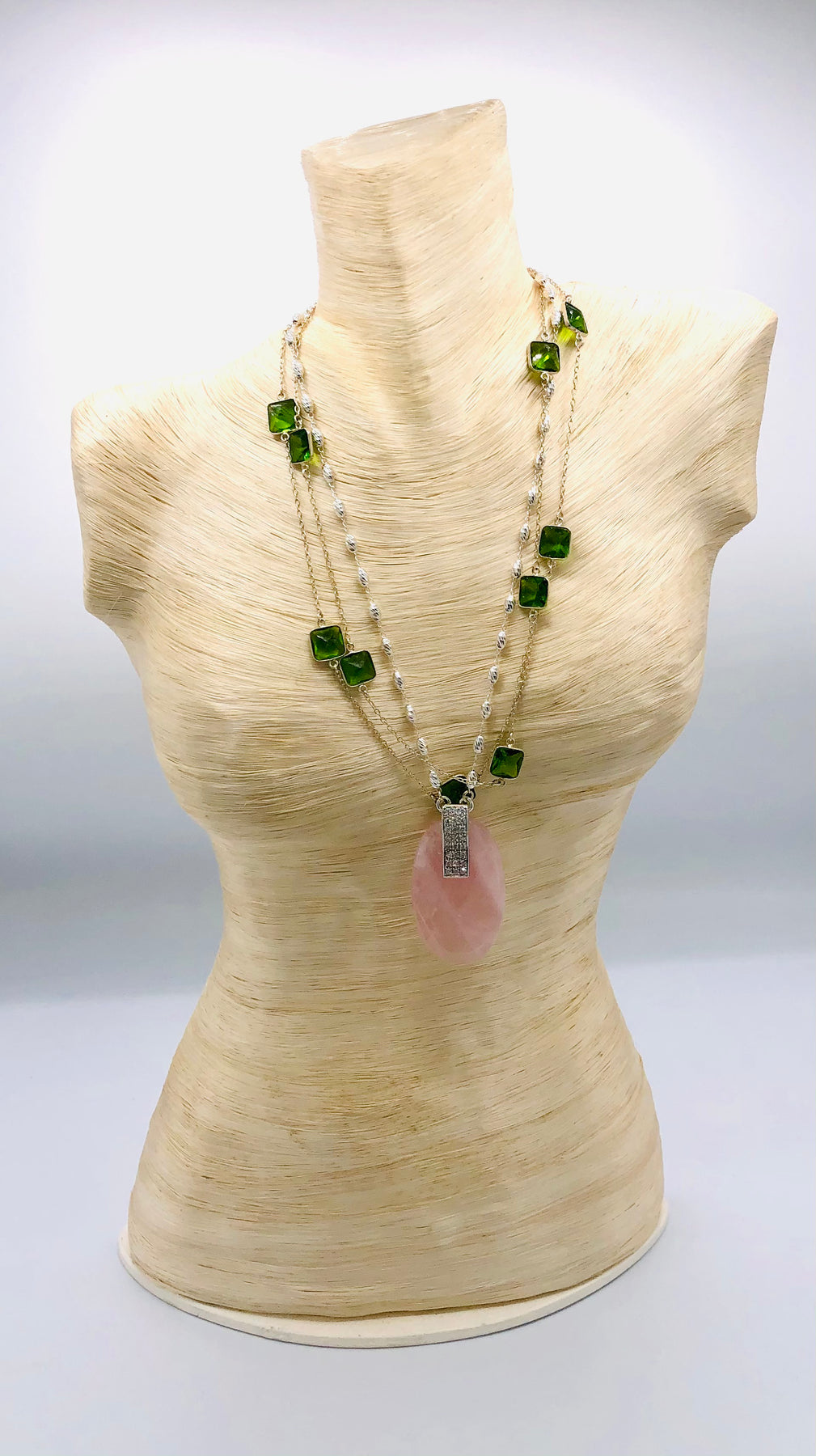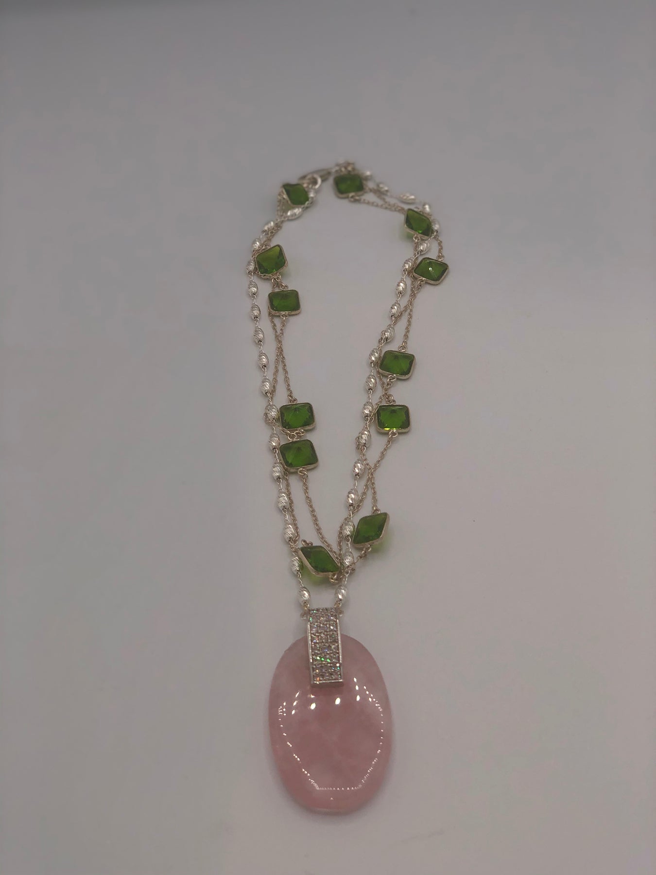 Emerald, Cubic Zirconia, Rose Quartz and Sterling Silver. 20 inches long Pendant 2.5 by 1.25 inches