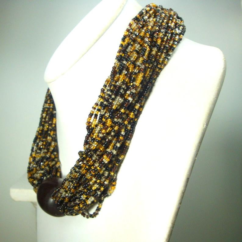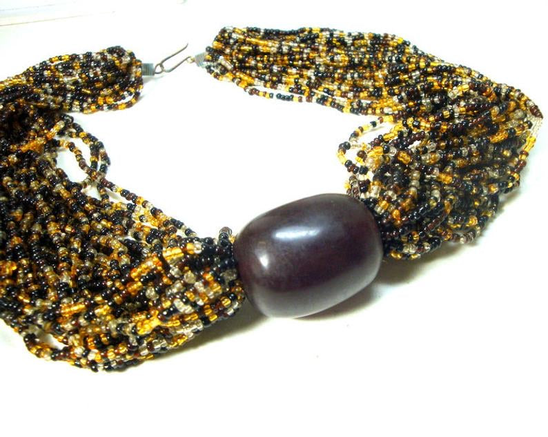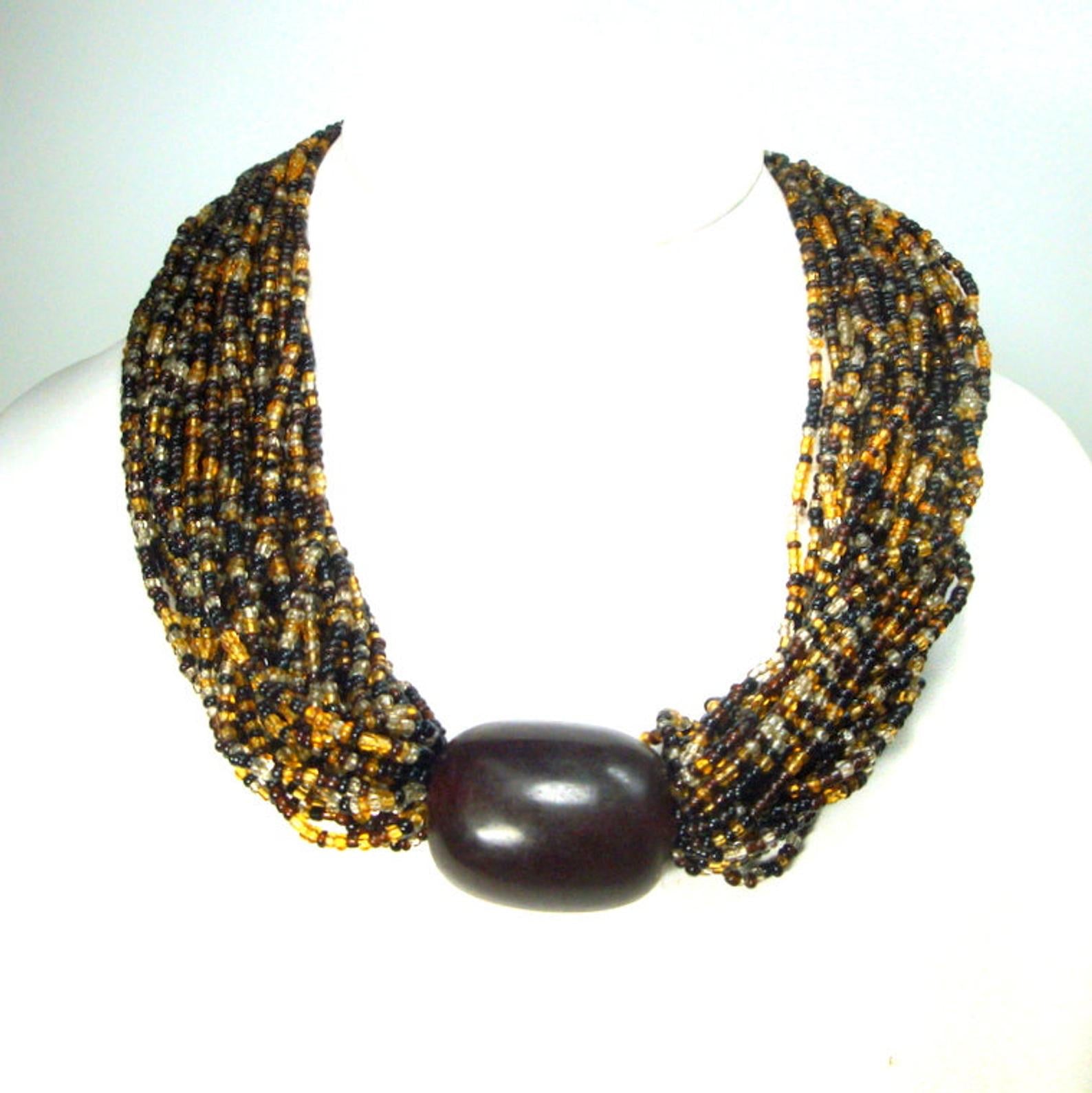 A Dramatic Vintage Torsade in Neutrals. Chunky Brown Tan Black Choker, 40 Strands Seed Beads, Tribal Bold Glass Necklace, A Dramatic Vintage Torsade in Neutrals