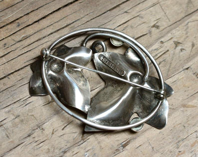 Vintage Ivy and Vine Sterling Silver BroochTwo Ivy leaves and 4 berries encircled in vinesReminiscent of Art Nouveau styling, but made in the late 1940'sMarked Sterling