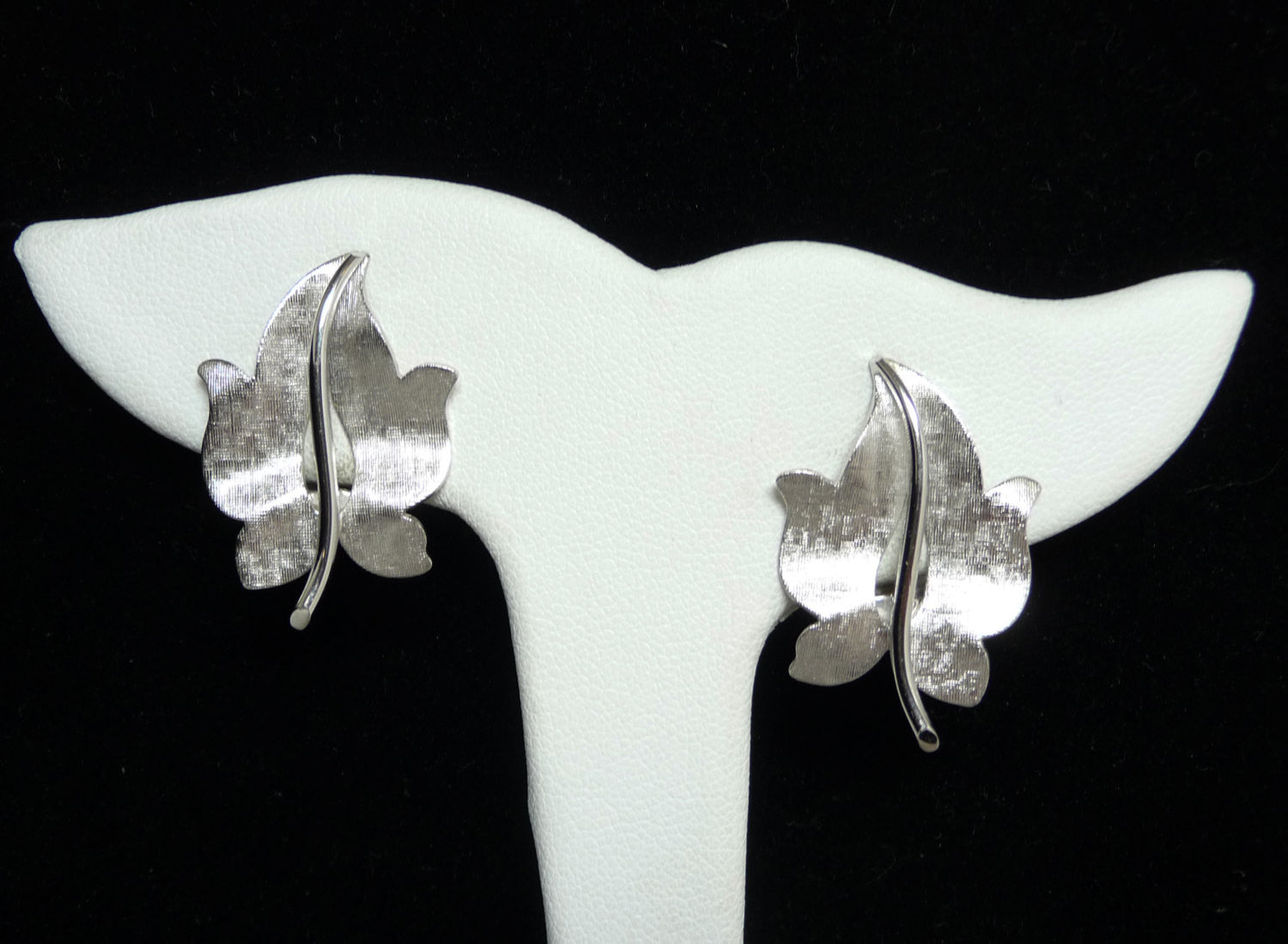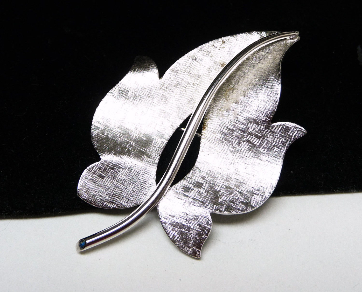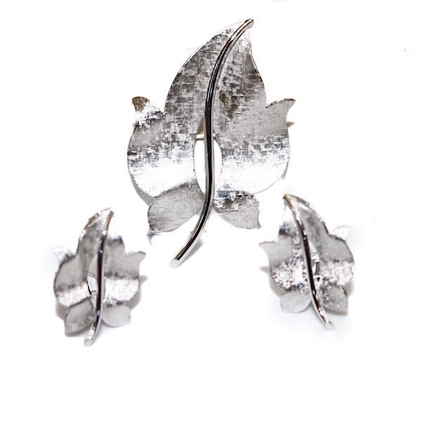 Classic jewelry in satin tone with a high polished vein moving through the center of the broad leaf. This is a lovely brooch and clip on earrings in sterling silver made by a well known company who made jewelry in the Early through Mid 1900's.