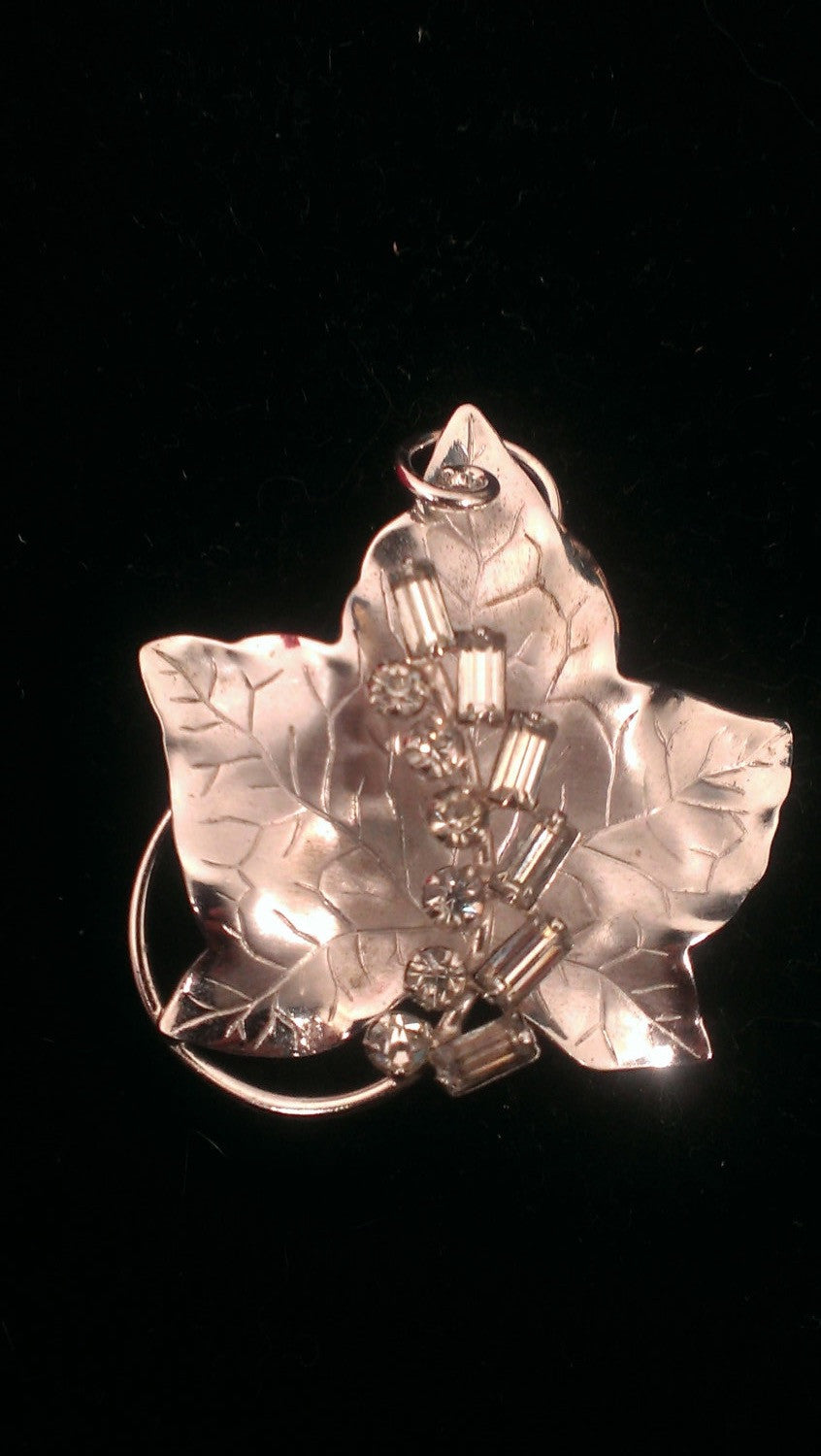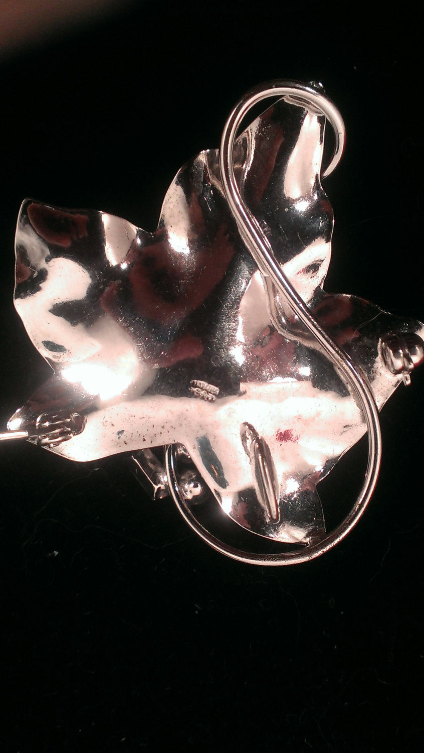 This pin is in great condition. It has a great shiny new look to it still. This pin has a brighter and lighter tone than most I have seen circulating around. It is stamped on the back both sterling. Thr rhinestones are nice and bright. There is a makers mark under the sterling that is a arrow through a CA. This is the stamp for Carl-Art who manufactured during 1936-1976.