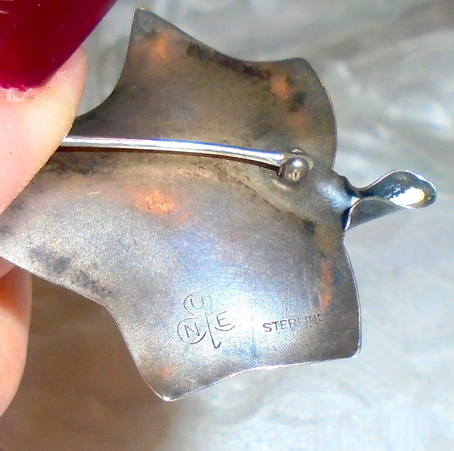 Classic Ivy leaf brooch by Stuart Nye of North Carolina. The Nye company has been producing hand-made jewelery based on nature since 1933. This design appears in their cataloge as "maple leaf" , though it resembles an American sycamore or plane tree also. The lobed and serrated leaf is gently convex, with a pinched and folded stem. Hand-incised lines indicate ribs and veins. The back is stamped Nye Sterling, with the name in the company's cloverleaf logo.