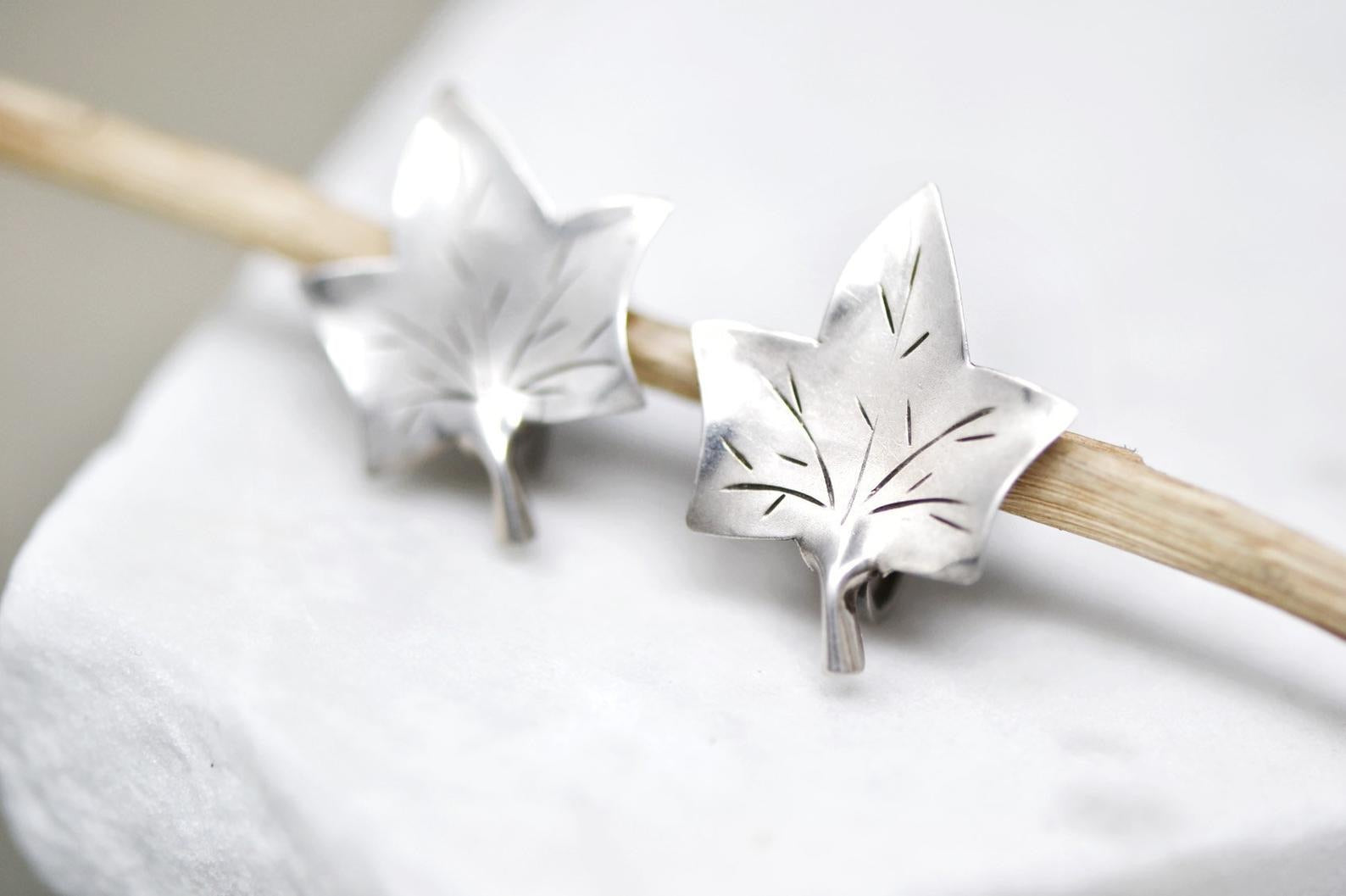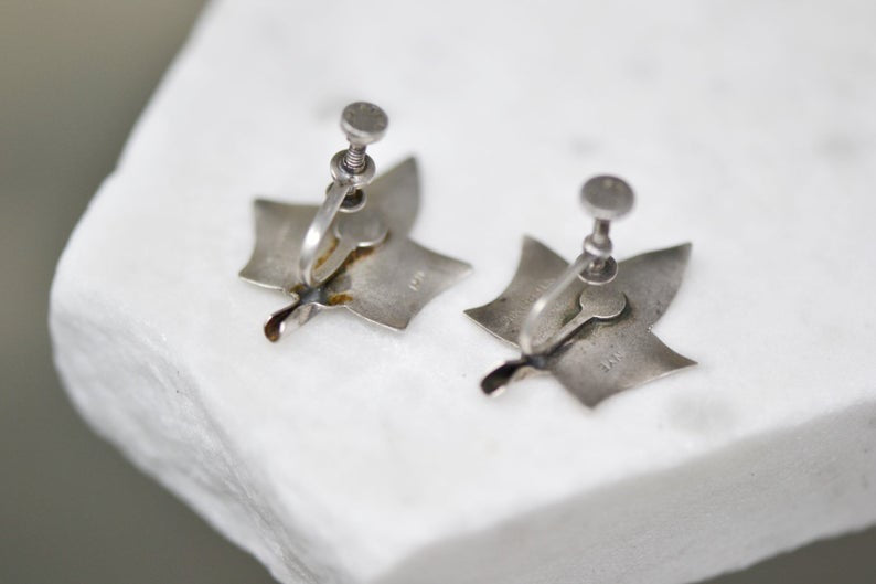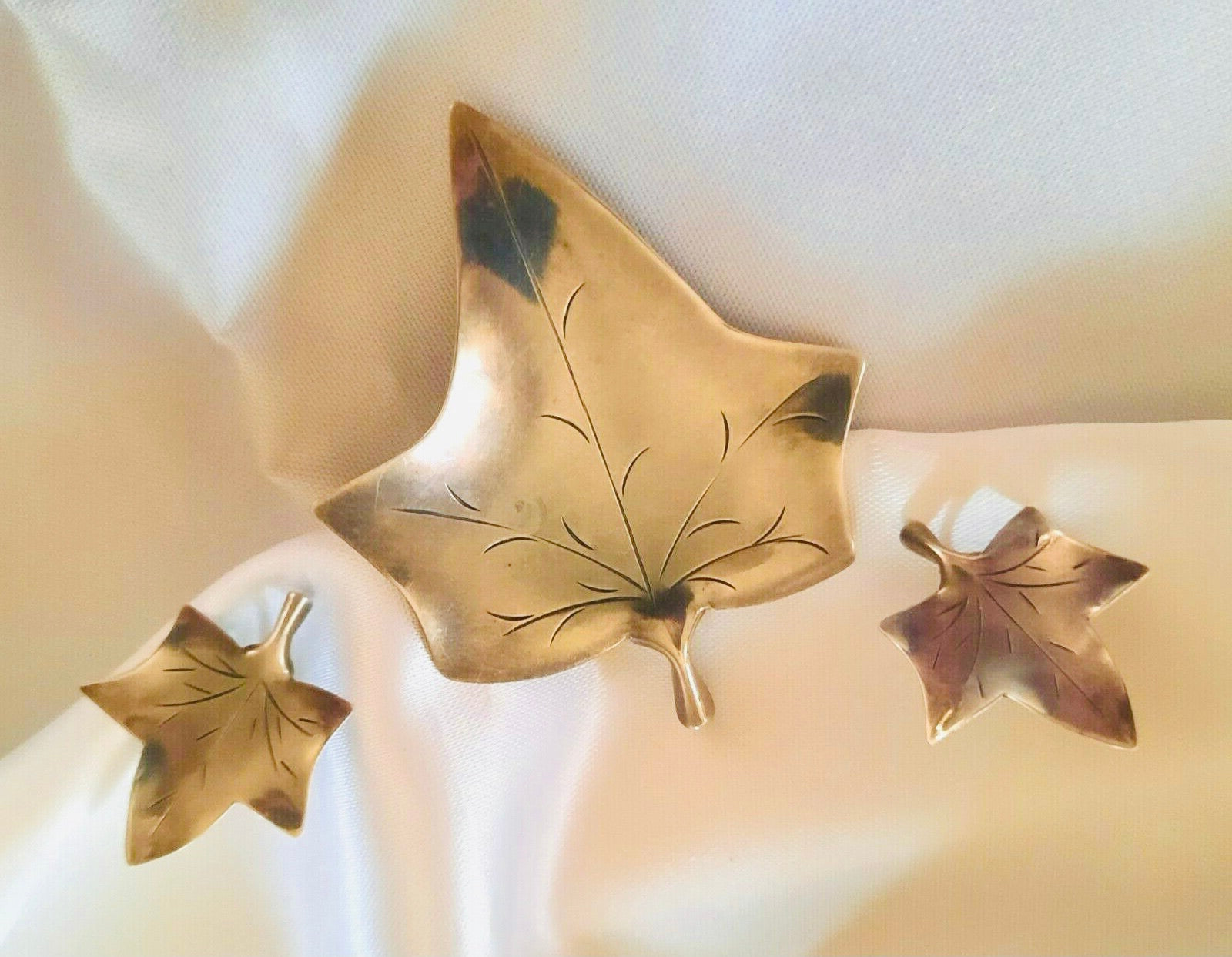 Stuart Nye demi-parure including a pin (brooch) and a pair of screw-back earrings in the popular maple leaf pattern  Crafted of sterling silver, the set weighs a total of 8 grams and is a beautiful representation of maple leaves found in nature.  The pin measures 2" long by 1-3/4" wide and the earrings are 1" long by 3/4" wide.  The condition is excellent with no repairs, and will be cleaned and polished.