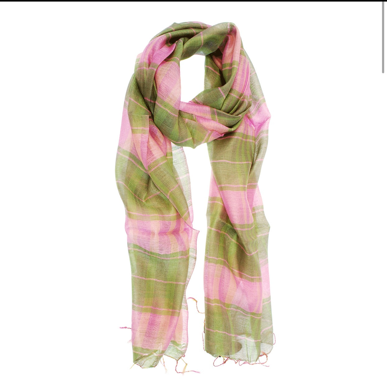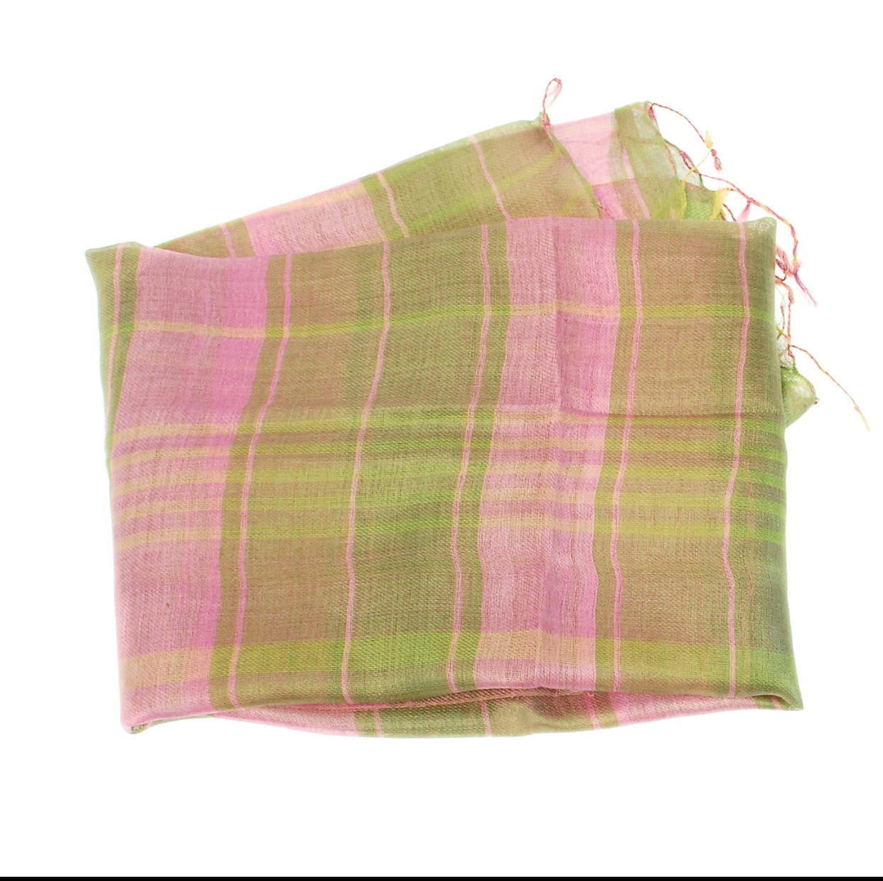 Pink & Green Plaid Silk-Blend Scarf with Tassels