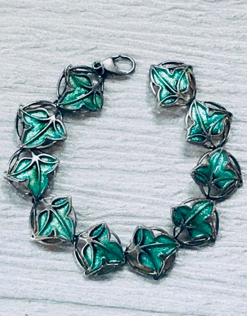 Vintage 925 Signed Silver & Green Enamel Leaf Link Bracelet – marked on backside - 6.25 x 5/8th’s inches – VERY GOOD condition