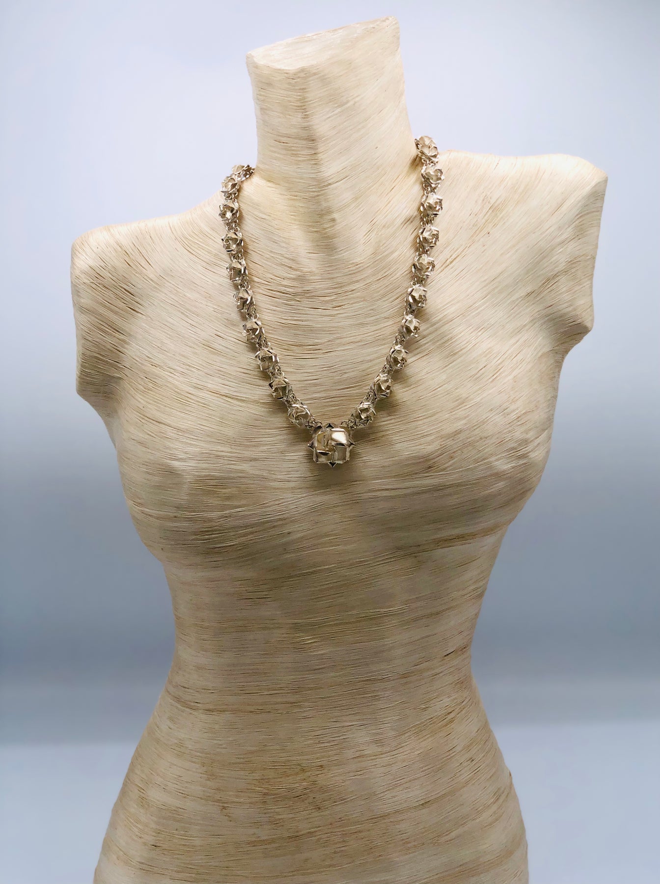Sweet romantic, Mexican Taxco artisan hand-crafted sterling silver necklace features dimensional bilateral rose flower link chains connected by a larger rose flower center. The rose blooms are very secure and are double linked. Hook and eye clasp closure.